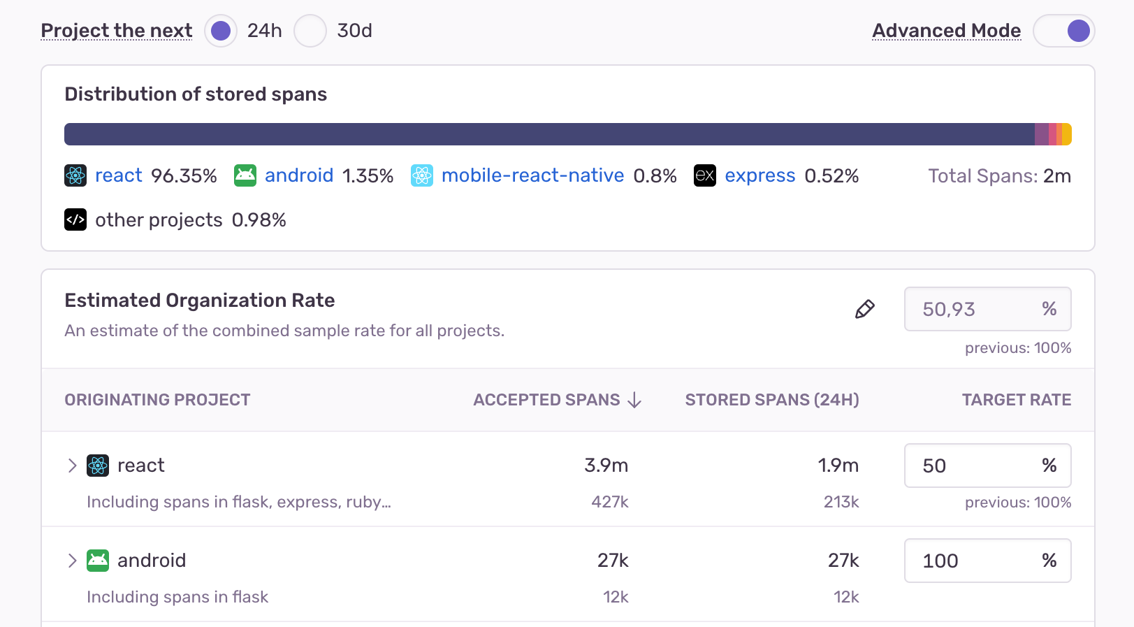 When you edit the sample rates for individual projects, an estimated overall sample rate for your organization will also be calculated. This is a weighted average based on the volume of traffic for each project. Keep in mind that this value is an estimate and may change as the volume of traffic fluctuates.