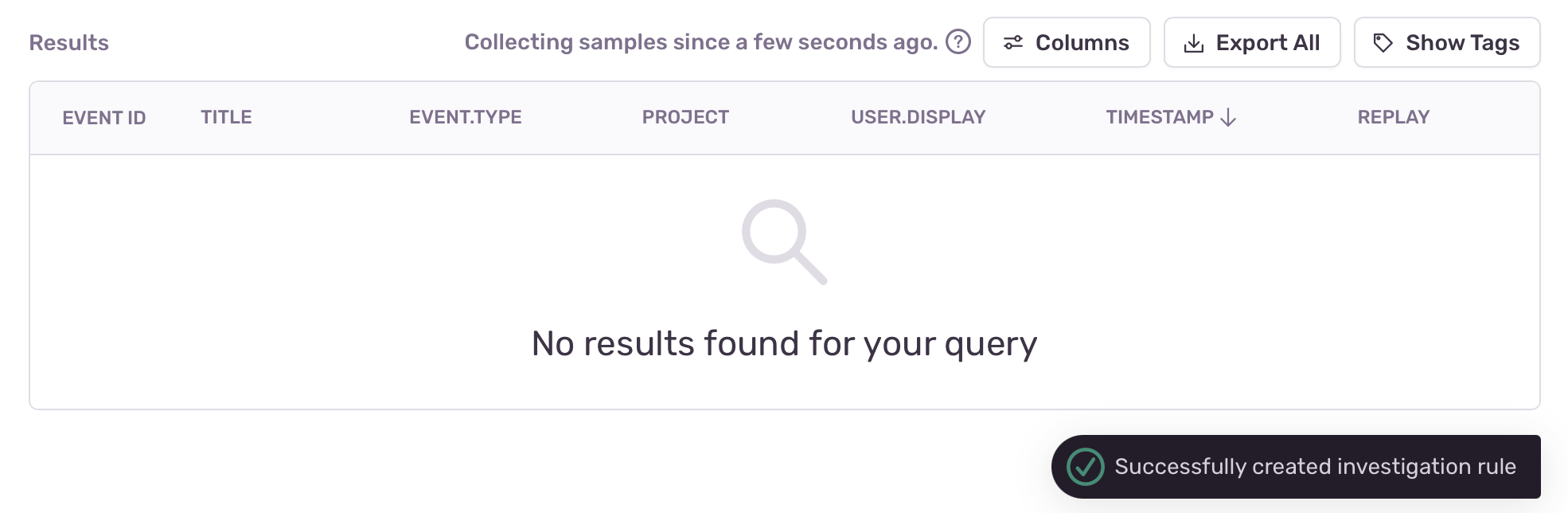 Investigation rules are sampling rules that can be created through the Sentry UI to temporarily boost the number of events collected for a particular scenario (for example, events with specific tag values). These rules can be created to retain more samples when too few (less than 5) are available. Once created, a rule will be active for up to 48 hours or until 100 samples are collected. You'll be notified via email when enough events have been collected.