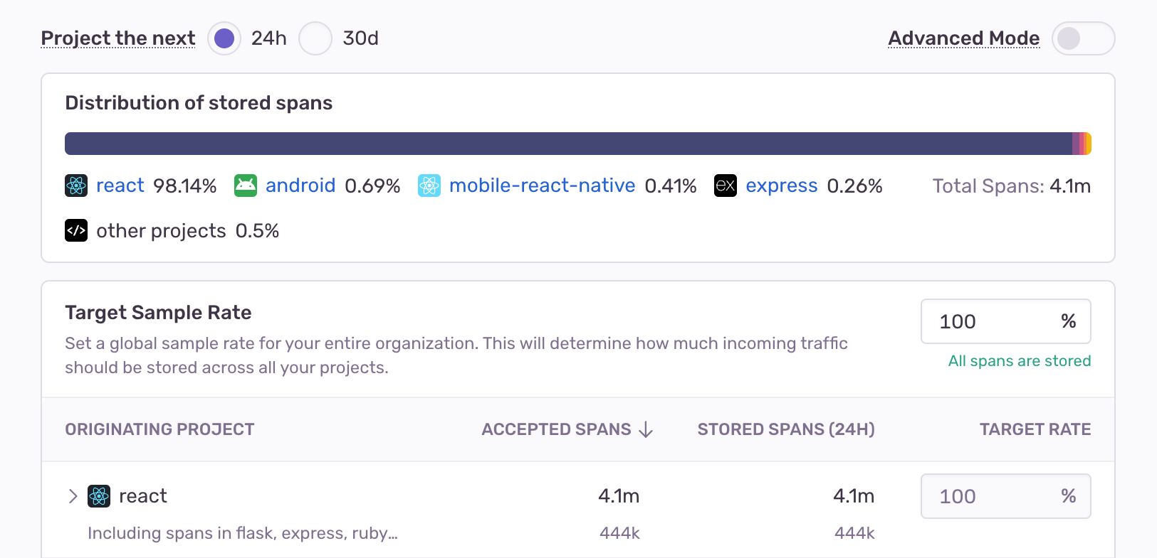 Additionally, advanced mode is not active, Dynamic Sampling continuously monitors the traffic for each project and adjusts the sample rate of each to prioritize the most relevant data.