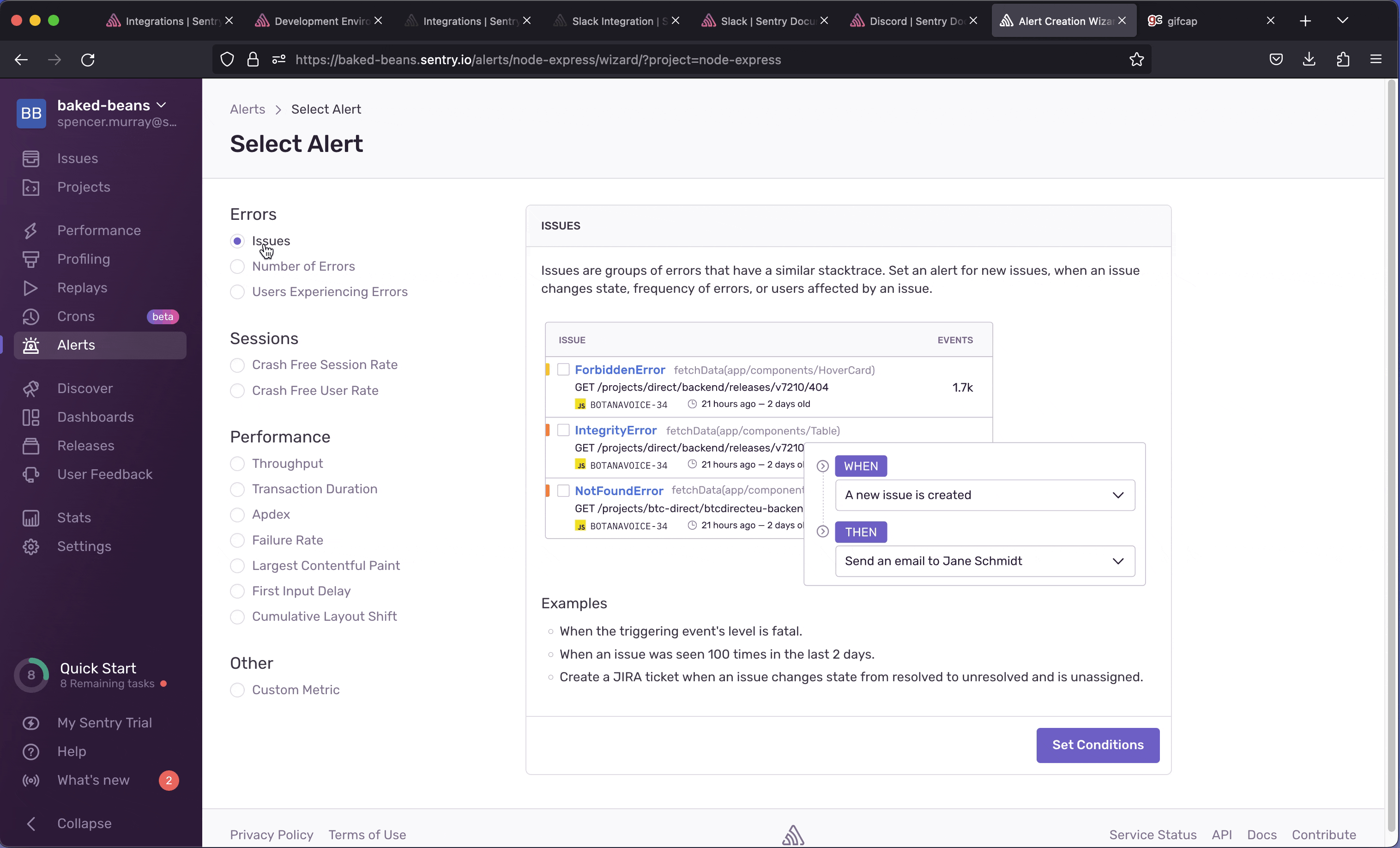 To create an issue alert that sends notifications to Discord, follow the steps below: