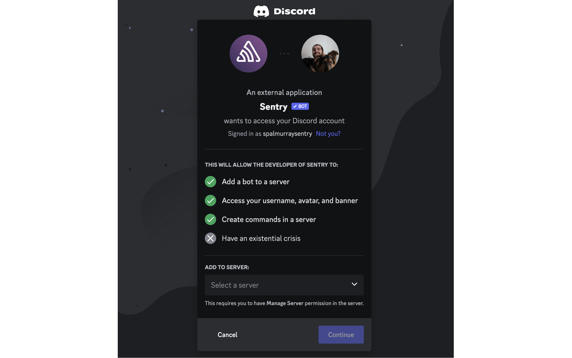 4. Use the dropdown menu to select the Discord server you'd like to add Sentry to and click "Continue".