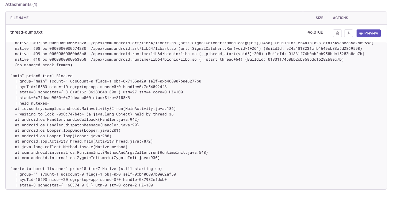 The SDK makes it possible to send the ANR thread dump from ApplicationExitInfo#getTraceInputStream as an attachment. This is useful for performing deeper investigations using all available information from the OS (in addition to the SDK parsing the thread dump into threads with stack traces):