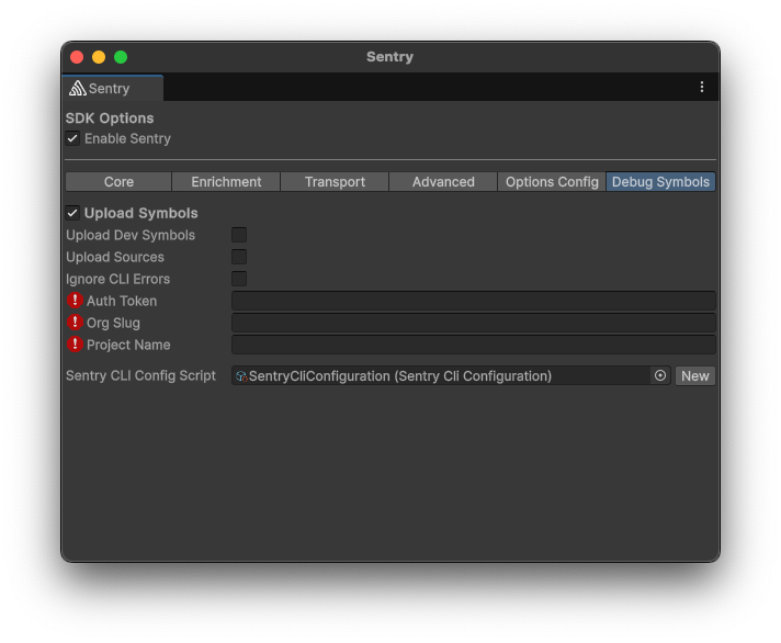 The Unity SDK includes Sentry CLI as a tool to upload debug symbols to Sentry. These debug symbols are used in processing events sent to Sentry to provide stacktraces and linenumbers. This page describes the options available to configure the Sentry CLI.