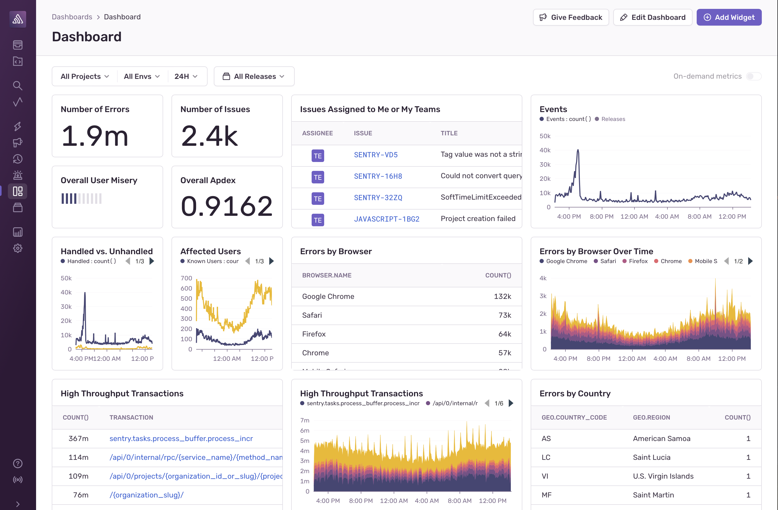 Sentry's Dashboards provide you with a broad overview of your application’s health by allowing you to navigate through error and performance data across multiple projects. Dashboards are made up of one or more widgets, and each widget visualizes one or more dataset.