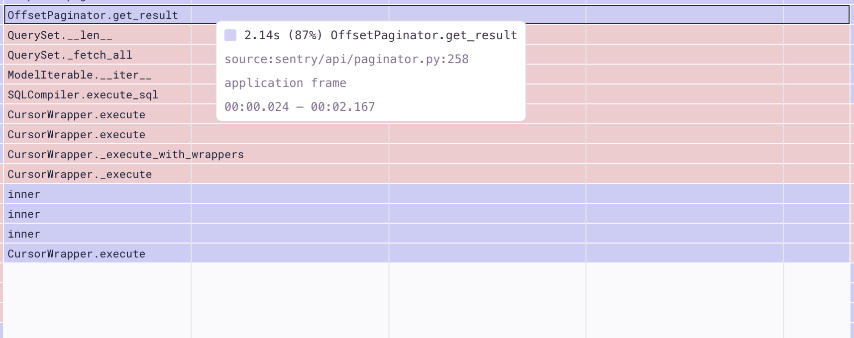 This image shows a section of a flame graph, starting with the function OffsetPaginator.get_result, which takes 2.14s to execute. 2.14s is the function's total time. Looking further down the stack, you can see that nearly the full 2.14s is taken up by the child function, CursorWrapper.execute, which executes a slow database query.