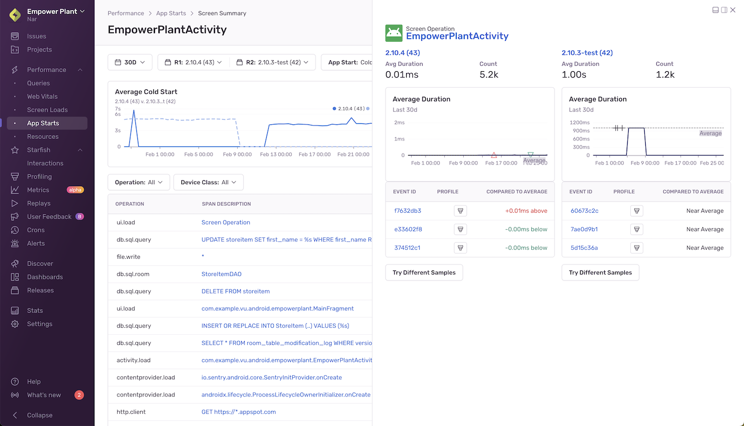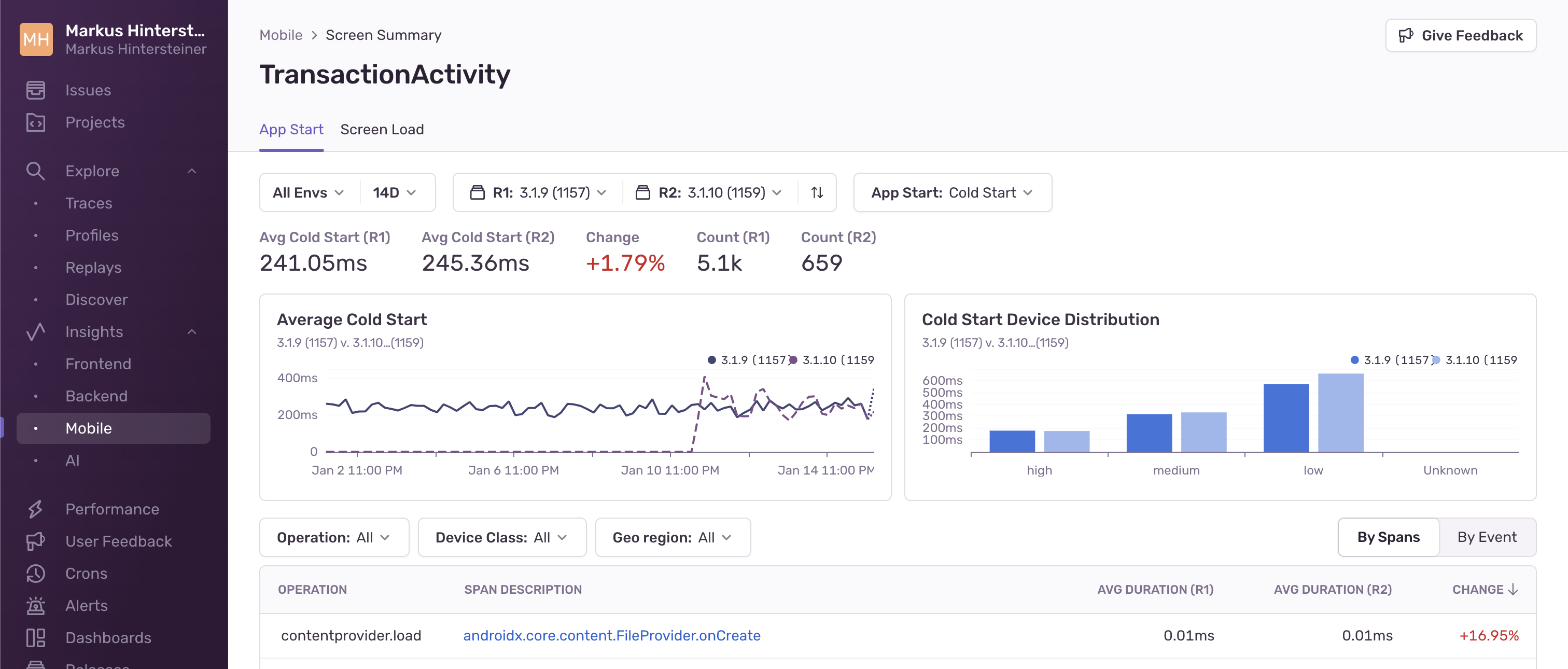 The table at the bottom shows spans that have changed from one release to the next and allows you to filter for specific span operations and device classes. Being able to narrow down to specific event samples helps debug slow starts.