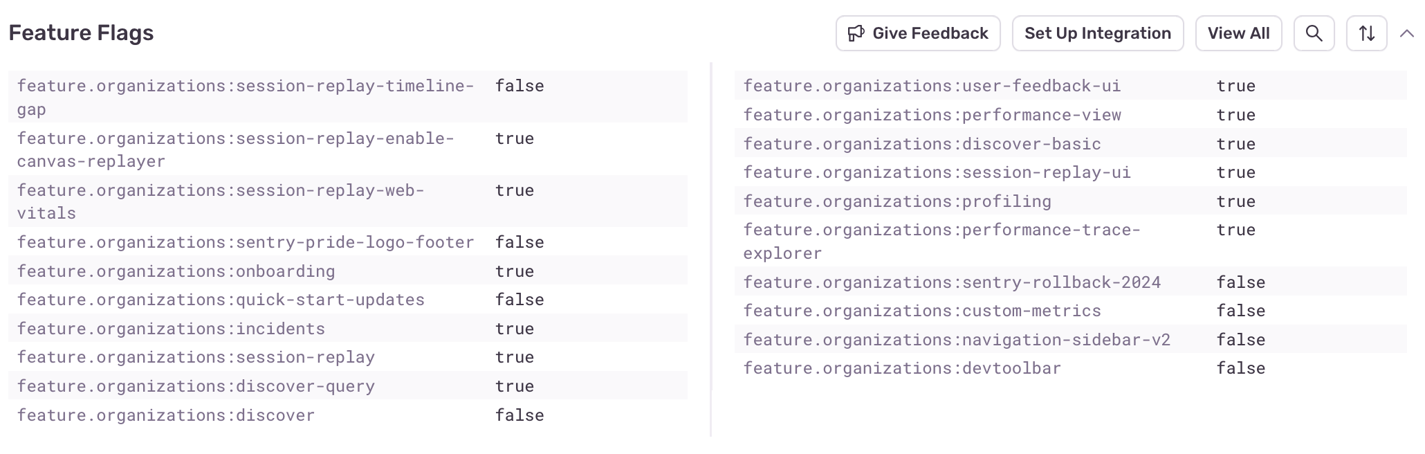 Enabling one or more of our evaluation tracking integrations will reveal the feature flag evaluation table. Here you can see an ordered list (in order of evaluation) of all the flags evaluated and their evaluation results prior to the error event.