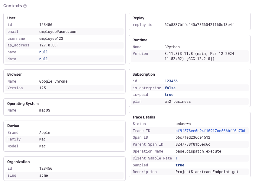 The Contexts section contains related key/value items (not just strings) that you've set manually in your application, or have been automatically added by Sentry. Contexts are meant to provide you with related sets of data to help with your debugging.