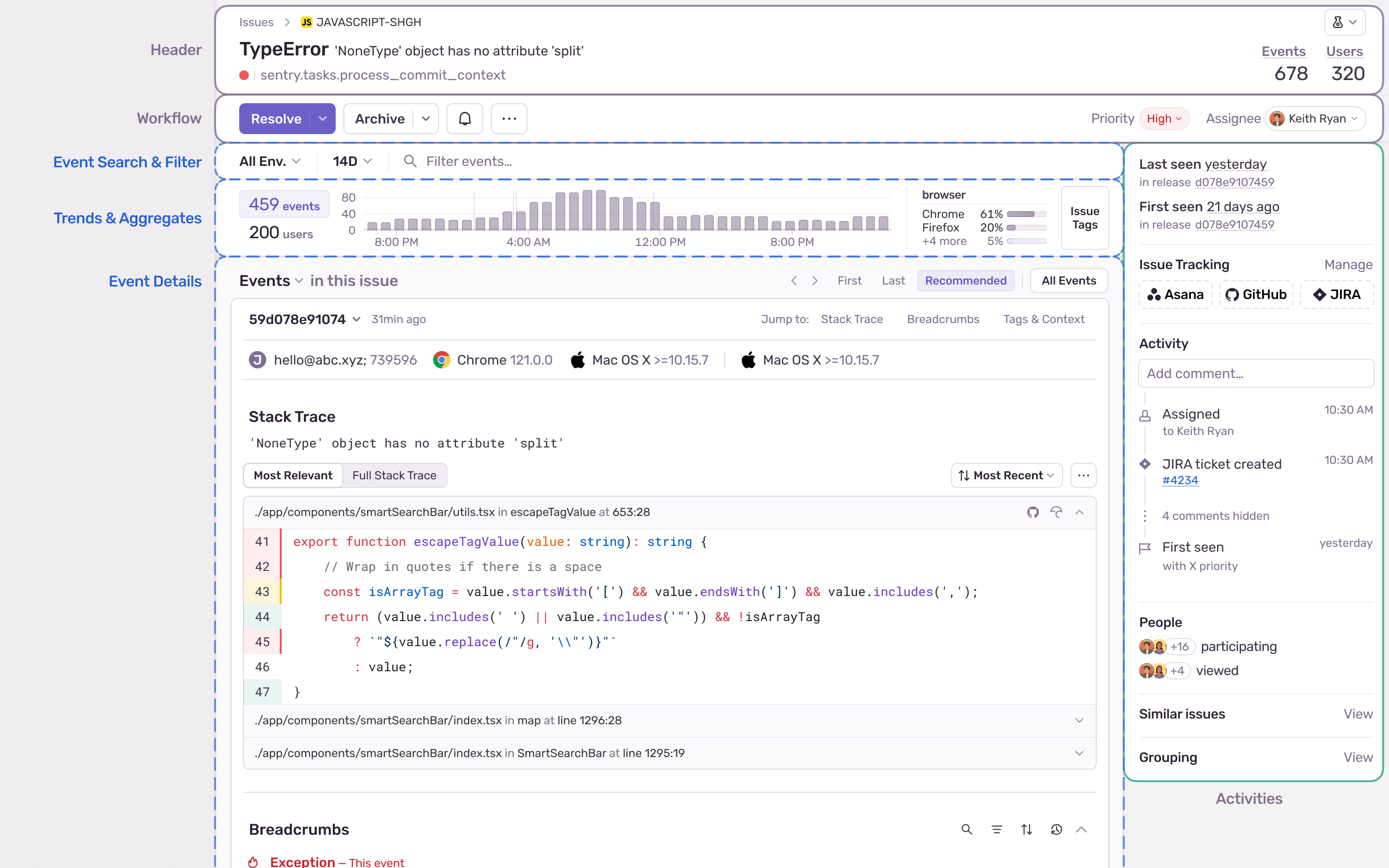 The header contains high-level information about the issue such as the error message, total counts of how often it has been seen, and how many users it has affected. Actions such as assigning, resolving, and archiving are also here.