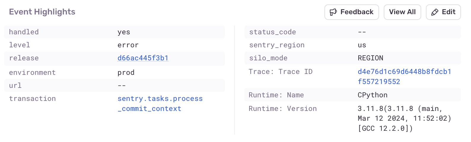 By default, Sentry will surface a few common tags and context values based on your project's platform. However, these highlights are intended to be customized to best fit your needs. Project Admins can click on the "Edit" button to add or remove any highlights they see fit and apply those changes across the project.