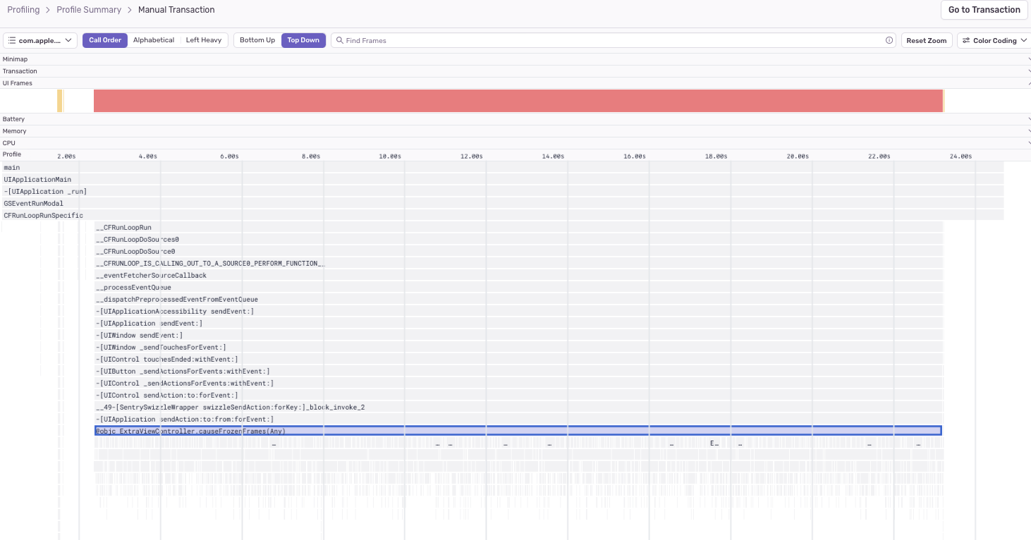 Profiling must be enabled for Sentry to detect Frame Drop issues. Once set up, Sentry will look for profiles that record a frozen UI frame and then search for the most time-consuming application function call delaying the display link's next vsync. In a run of functions calling through without any self-time, the deepest call will be chosen.