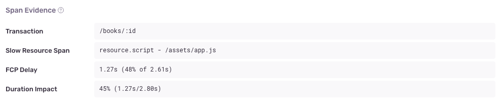 You can get additional information about your Large Render Blocking Asset problem by looking at four aspects in the "Span Evidence" section: